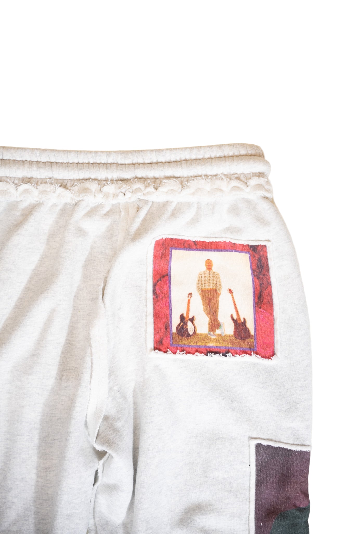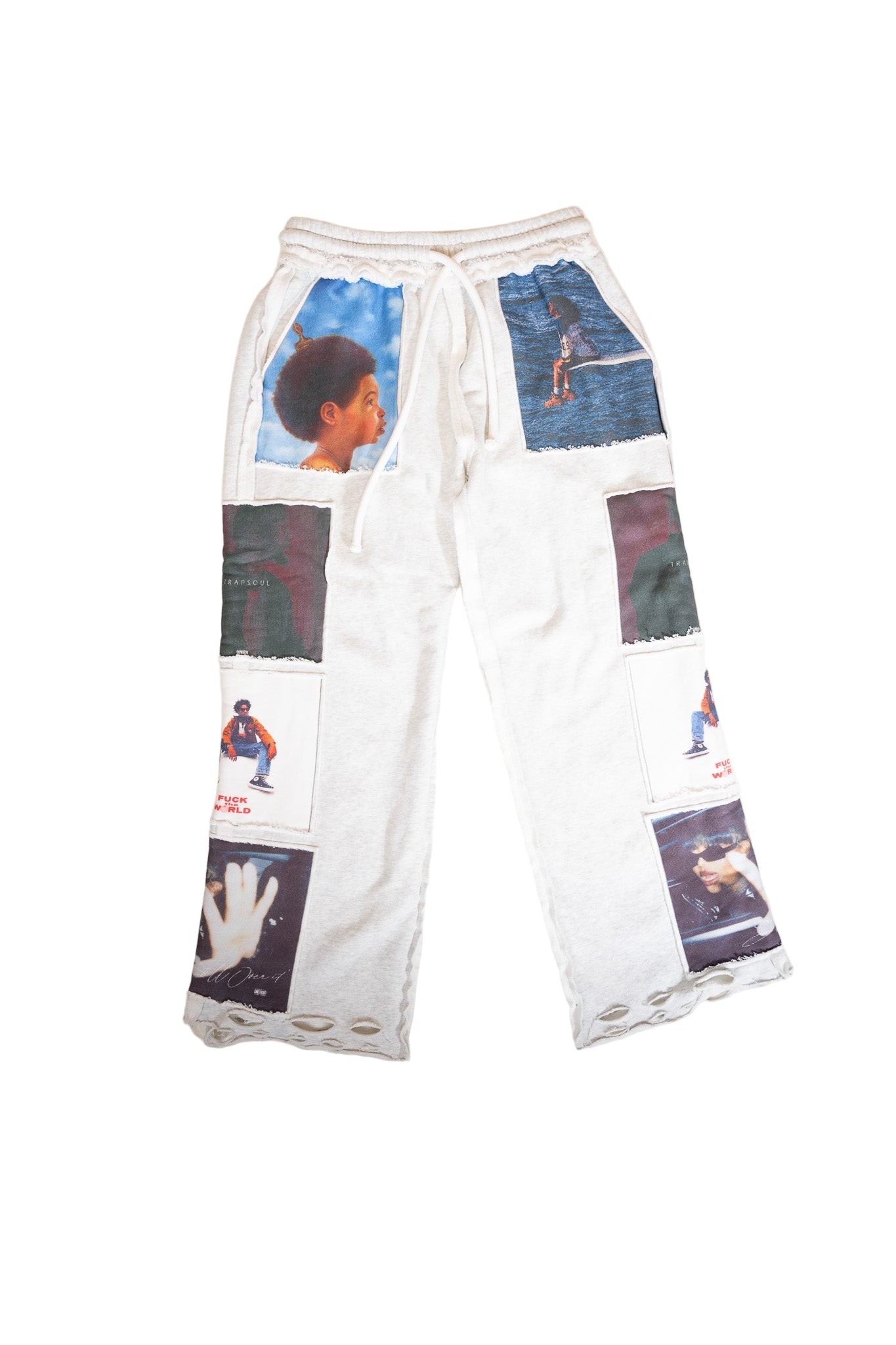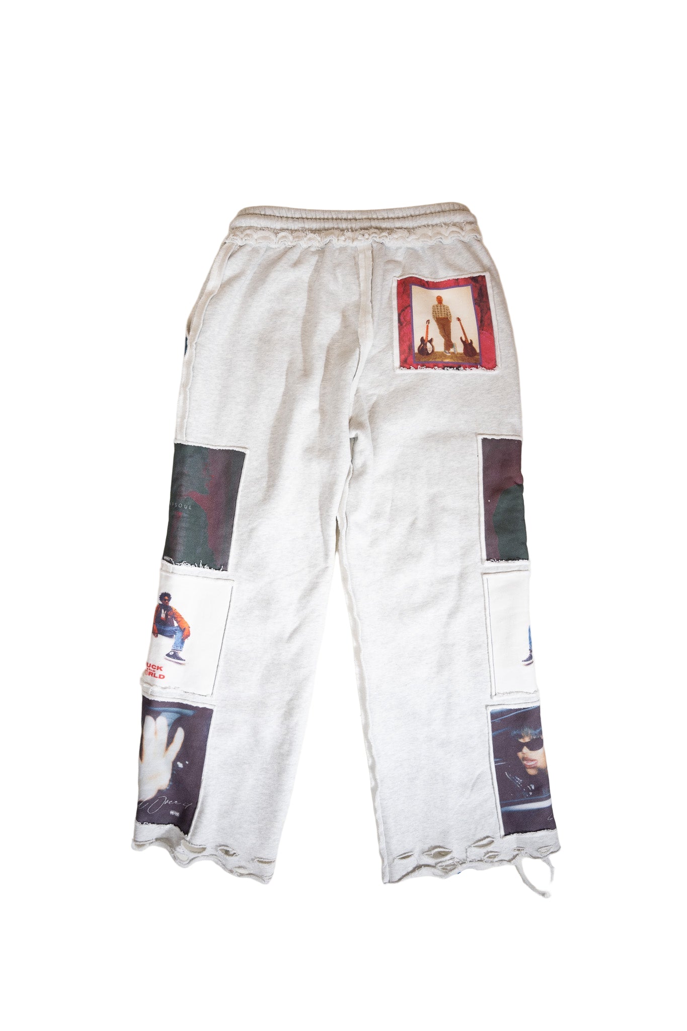 SWEATS FEATURE ALBUM COVER APPLIQUE PATHCES DOWN THE SIDE. AND A DTG PRINT ON THE POCKETS.