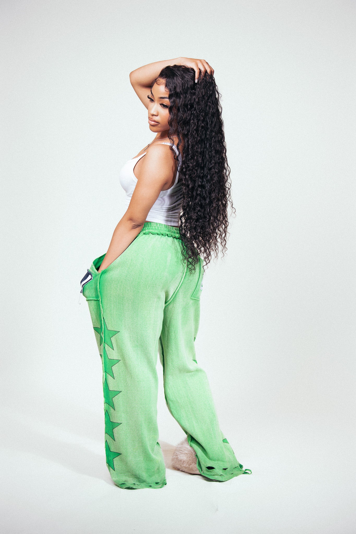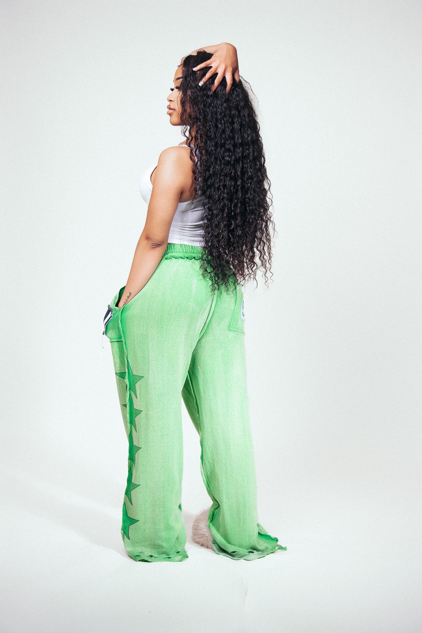 PANTS ARE UNISEX/BAGGY AND HAVE HEEL DRAG. ALL MODELS ARE WEARING A SMALL.
