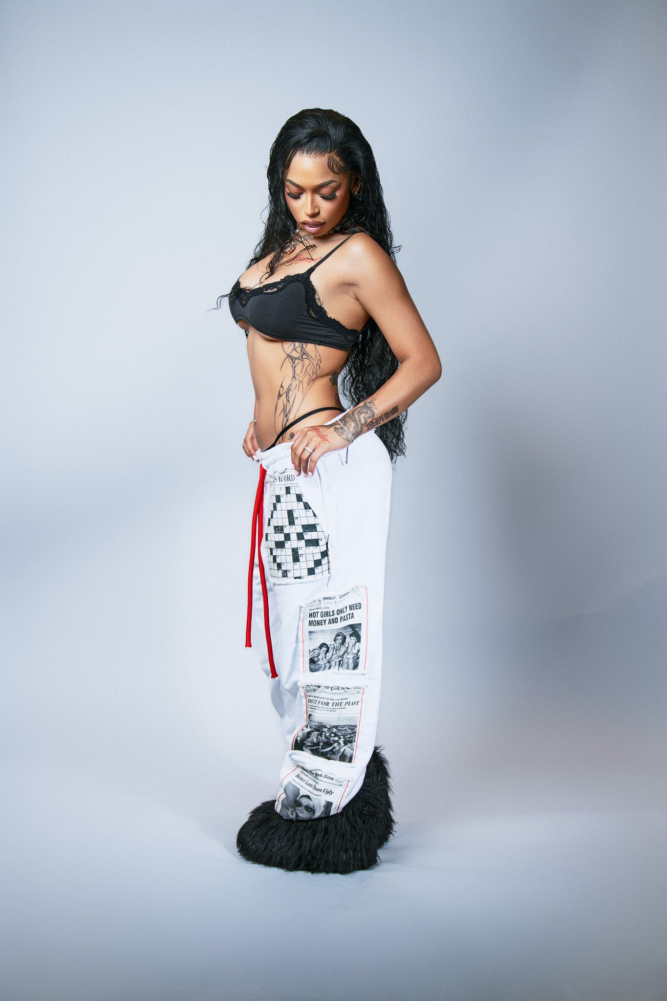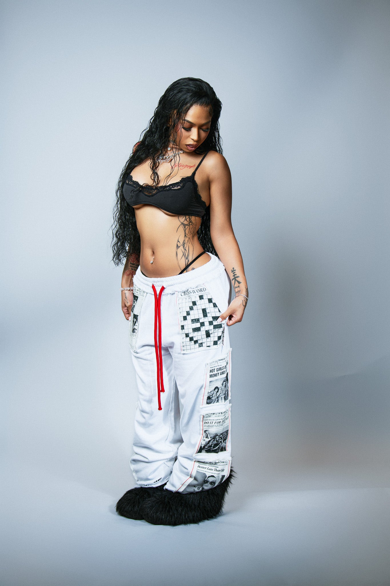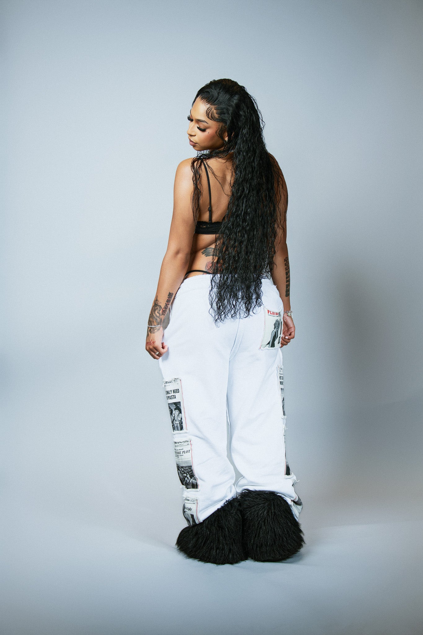 PANTS ARE UNISEX/BAGGY AND HAVE HEEL DRAG. MODEL IS 5'5 WEARING A SMALL.