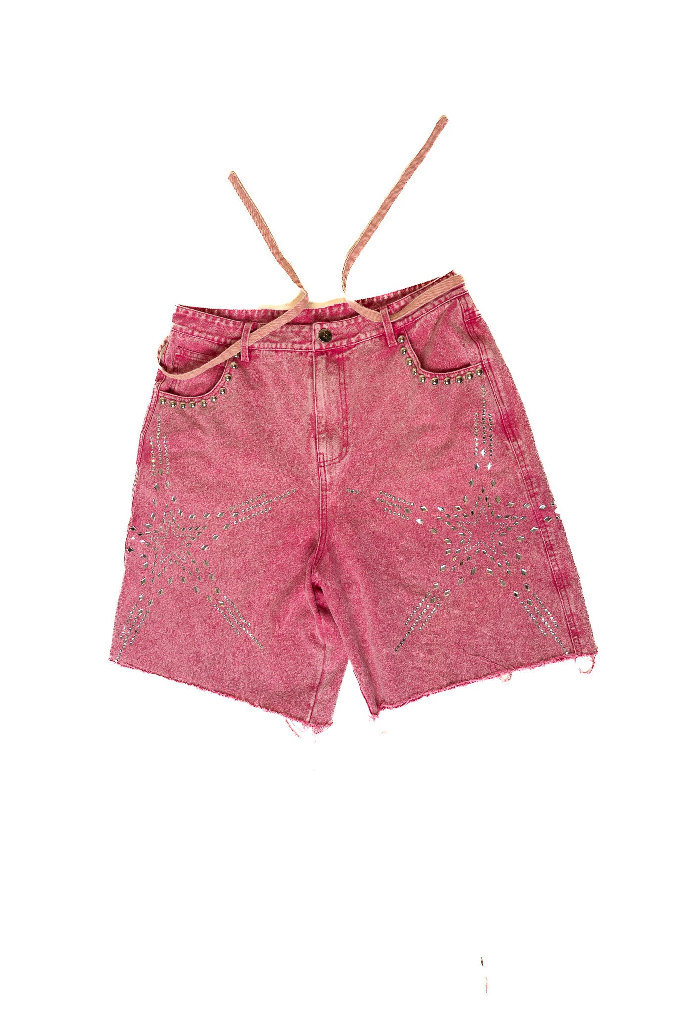 UNISEX SHORTS FEATURE STUDS AROUND THE POCKETS, RHINESTONES, AND A PINK DENIM BELT.